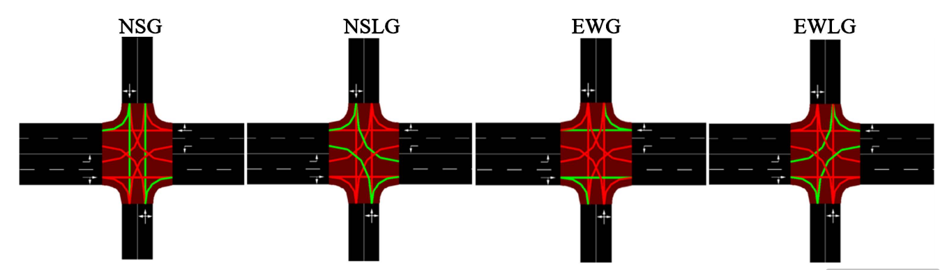 - NSLG相位:表示南北方向的车辆可以左转和右转,不允许直行,且东西方向车辆不允许通行;